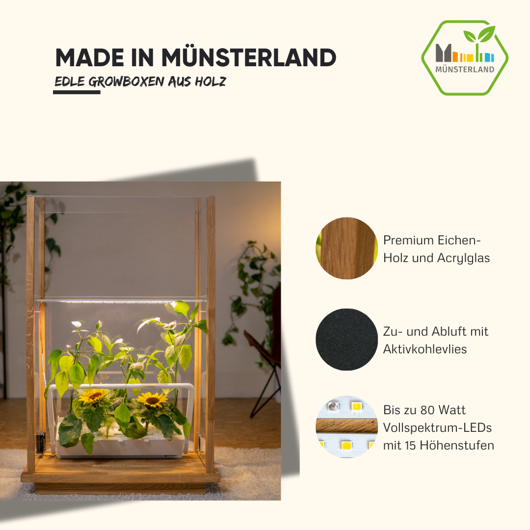 Du hast die Wahl zwischen Alternativen zur klassischen Growbox: Modular aus Holz und Acrylglas oder kompakt. Ästhetik trifft Funktionalität: Unsere stilvollen und modernen Growboxen integrieren sich nahtlos in dein Zuhause und sind ein echter Blickfang.