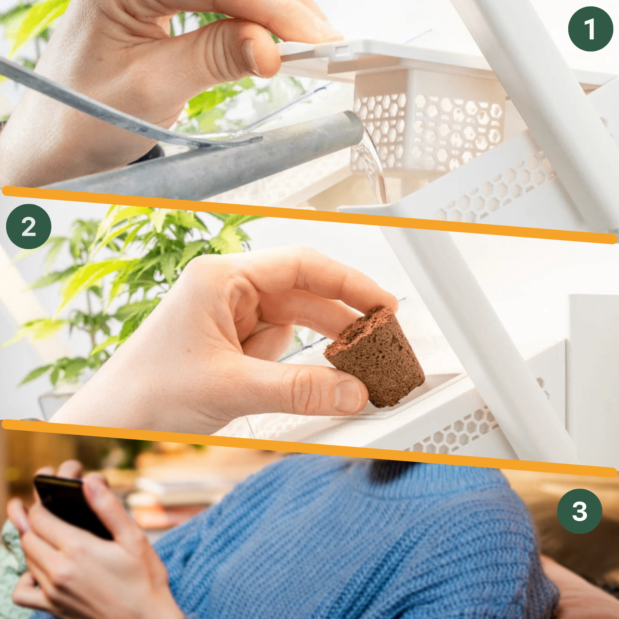 Wasser einfüllen, Pflanzenkapsel einsetzen, mit der App verbinden und starten.